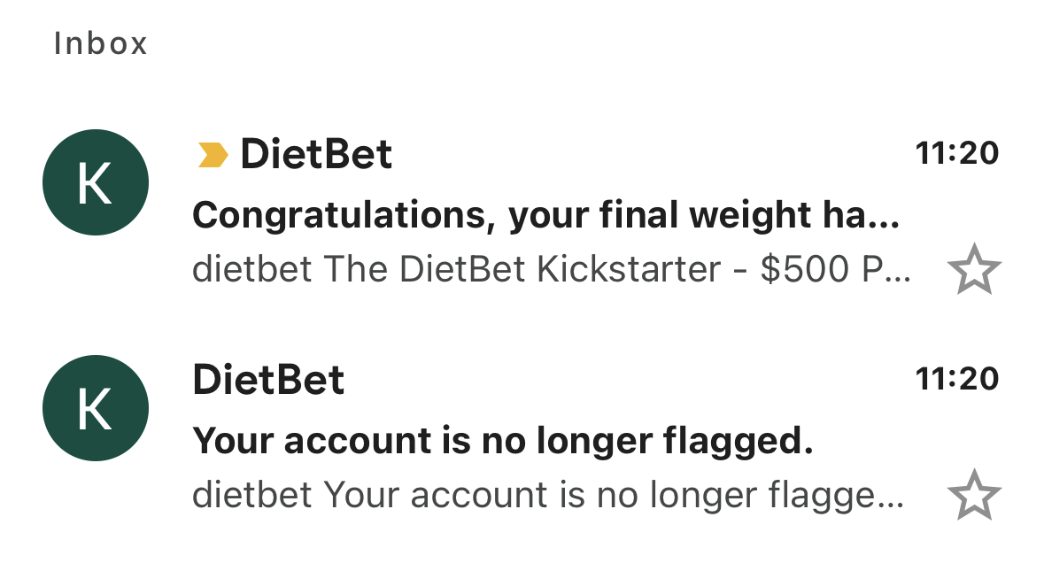 I did get some good news today: I won my Kickstarter that ended yesterday, AND the DietBet scrutiny has been lifted!
