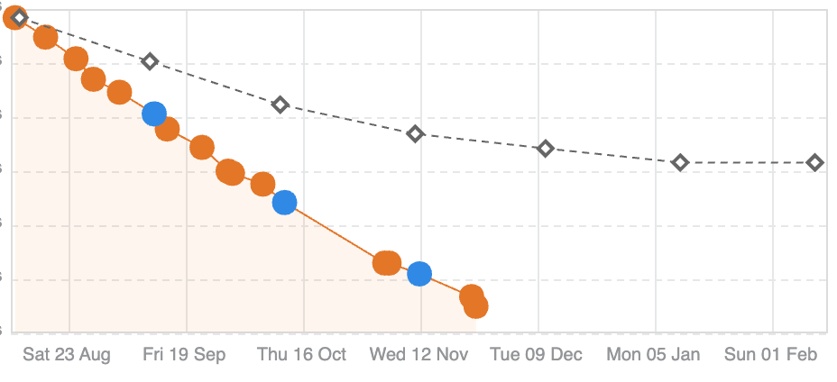 It’s not a foregone conclusion. There are some major holidays coming up between now and then, as well as a 2-week trip I’m taking at the end of the year. There’s not so much a threat to my eating as there is to my normal activity level, but it could be enough to put the brakes on. Plus, this progress will naturally hit the skids at some point. When I start strength training, building muscle will slow the drops on the scale. And just generally speaking, this clip is unsustainable. Or at least, you’d think so — but bodies seem to REALLY hate sugar, and they party like crazy when it’s gone. With very little exercise between my Sunday-to-Sunday weigh-in days, mine still coughed up 4.2 lbs. I’m not saying I wasn’t still making an effort during what felt a bit like a lost week, but it was not the level of intensity I’d planned when it started, and still this big number showed up for me.