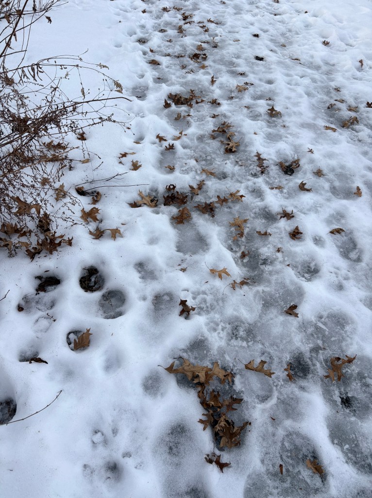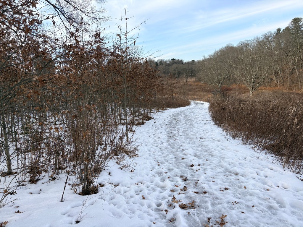 It was nearly 60° today, and there was enough sunlight by late afternoon that it wound up being a great opportunity for my first trail walk of the year. It was treacherous; the foot+ of snow we got last month has not been cleared, leaving it to melt on its own. The freeze-thaw cycle and intermittent sun has created a soggy, muddy, slippery network of pathways that are clear in some places, frosted over in others, and wet everywhere else. The climb to the top of the trailhead was almost too much for my worn-in sneakers. With ankle concerns fresh on my mind, I nearly turned back; if the entire trail was going to be like this, it seemed imprudent to risk a fall.