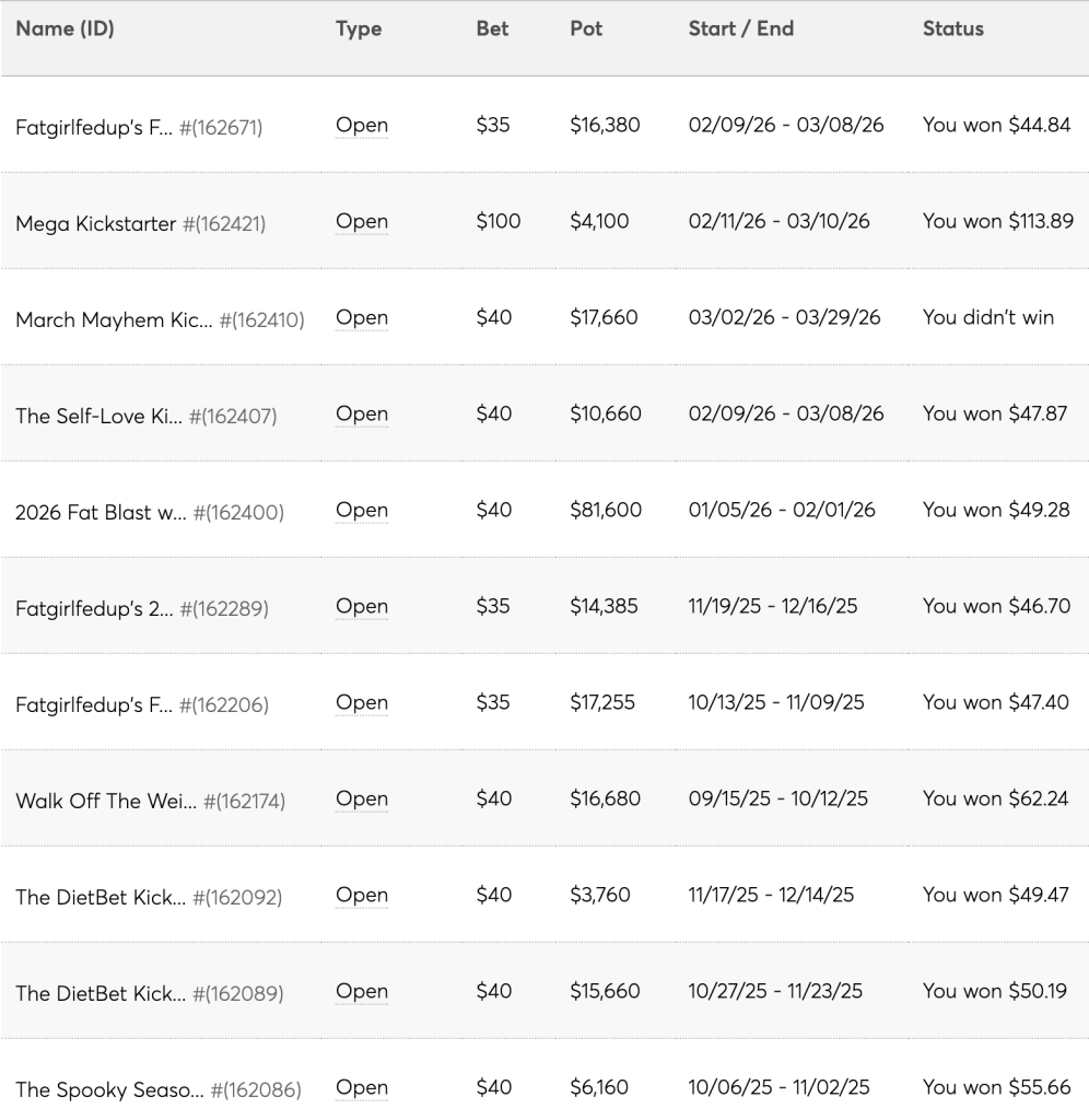 This was a real test of mettle. I could go extreme and over-exercise and under-fuel and wring my hands for the ensuing 24 hours, or I could honor my commitment and trust my body and the process to respond well enough to result in DB victories. After all, this whole thing is about so much more than a few DietBets. Winning/keeping money is great, but it’s in no way healthy to go full nutcase at the possible expense of the broader arc. That type of compulsive behavior is the ugly cousin of what got me to over 300 lbs. So I chose responsibly and made my peace with the fact that the die was cast already, and all I had to do was stay the course — my body had just given me a loud and clear signal that it was happy with what I was doing. This was a moment to listen, not to hijack the convesation.